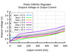 The dropout voltage of a step-down regulator is the minimum amount by which the input voltage must exceed the regulator’s target output voltage in order to ensure the target output can be achieved. For example, if a 5 V regulator has a 1 V dropout voltage, the input must be at least 6 V to ensure the output is the full 5 V. Generally speaking, the dropout voltage increases as the output current increases. The graph below shows the dropout voltages for the different members of this regulator family: